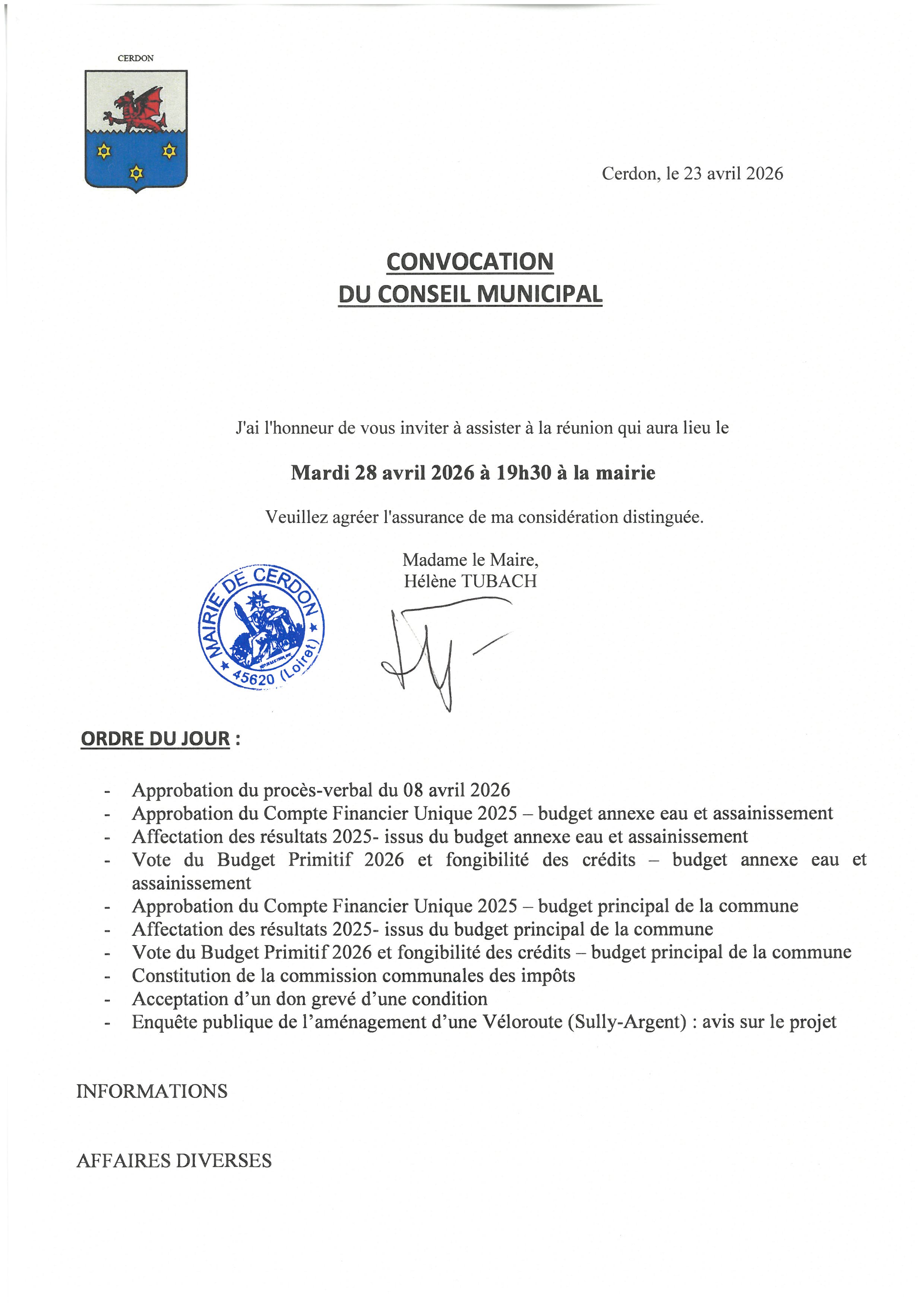 La prochaine réunion du conseil municipal se tiendra le mardi 28 avril 2026 à 19h30 à la mairie.