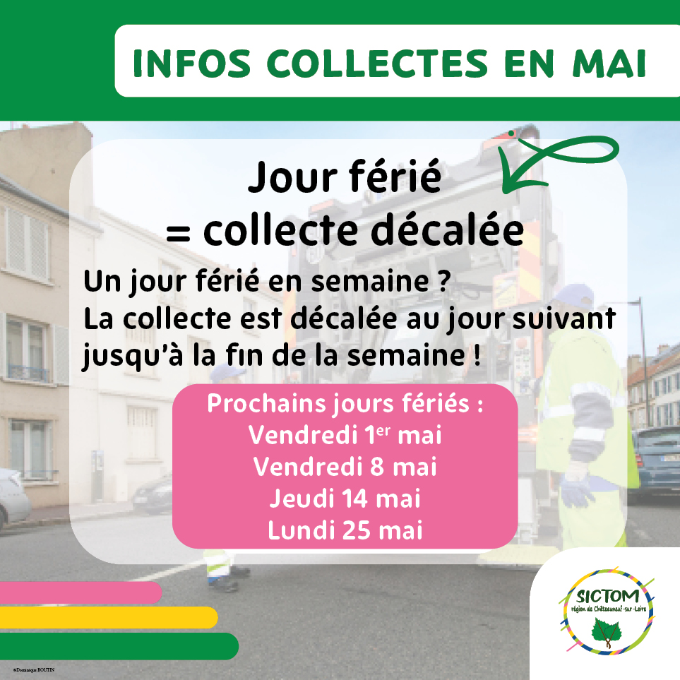 Lorsqu’un jour férié tombe en semaine, toutes les collectes de la semaine sont décalées au lendemain.
